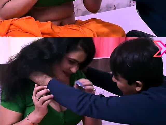 Amazing Asian mom with big tits blows patron's son's mind