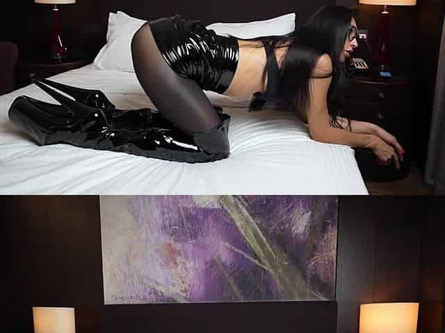 super lengthy legs in shiny nylon tights and a vinyl petticoat on additional lengthy stillets