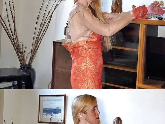 Fiona in sexy latex dress and black pantyhose showing her ass