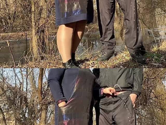 MILF in a short skirt pissing with pantyhose put down near the river.