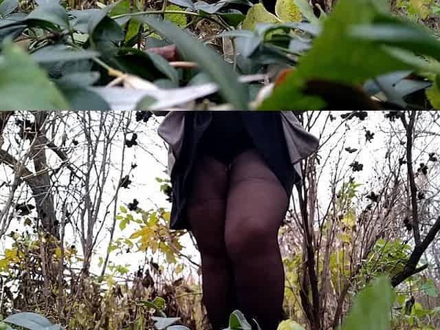 BBW milf in orange skirt pissing in nature, piss spilling down her ass.