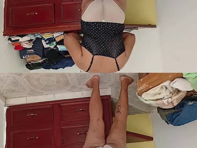Overweight Mommy Tidying Up Room And Folding Laundry three