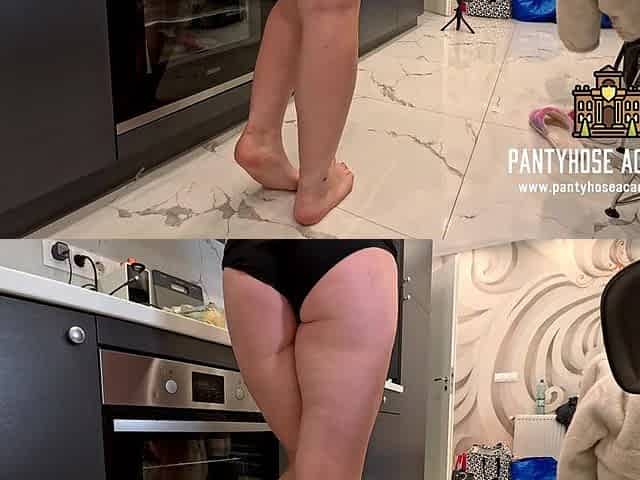 Big Tits Curvy and Busty Hot Beauty in Black Sheer Pantyhose in the Kitchen Takes Her Panties off