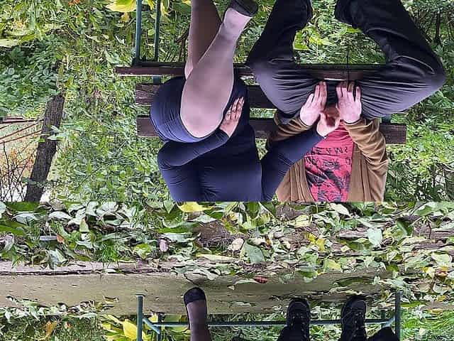 Naughty Milf in pantyhose pissing in the park on a bench rear view