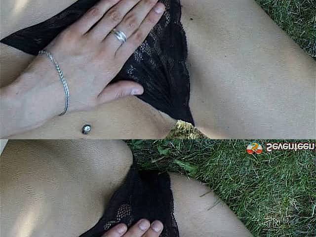 Yummy young chick Nessy is playing with her smooth pussy in the park