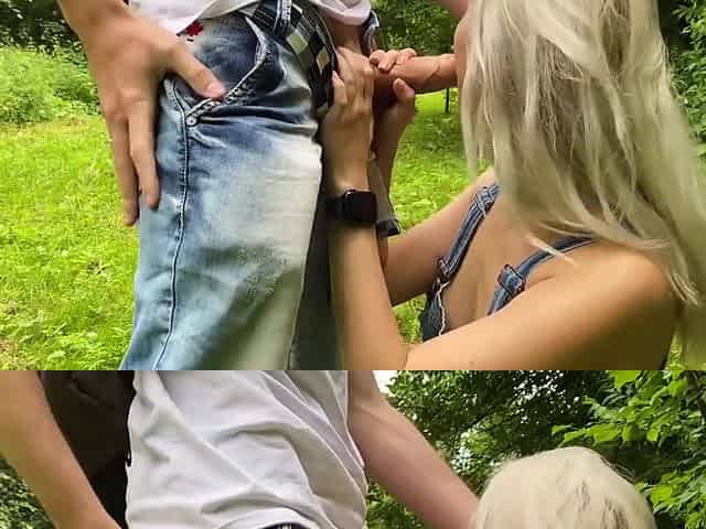 Aged blond woman is sucking a younger stud's schlong in a local park, previous to having anal sex