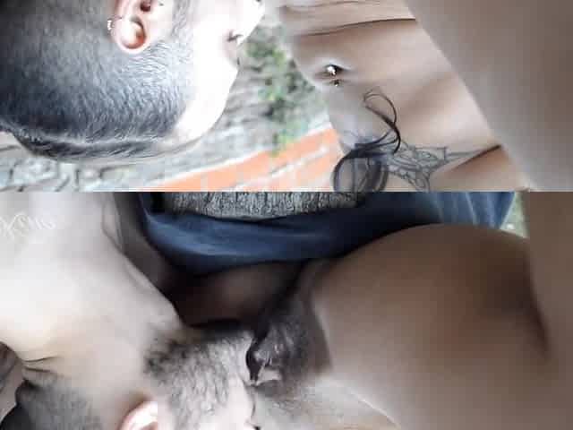 Lesbian couple with hairy pussies having fun outdoors in the park