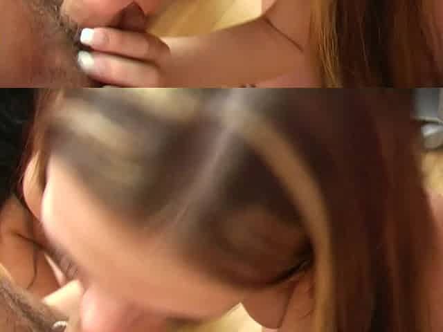 Platinum blonde and brunette babe suck on hard cock at same time