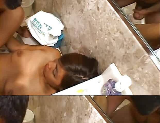 "Perky-titty babe deep throats and takes cock in bathroom and in bed"