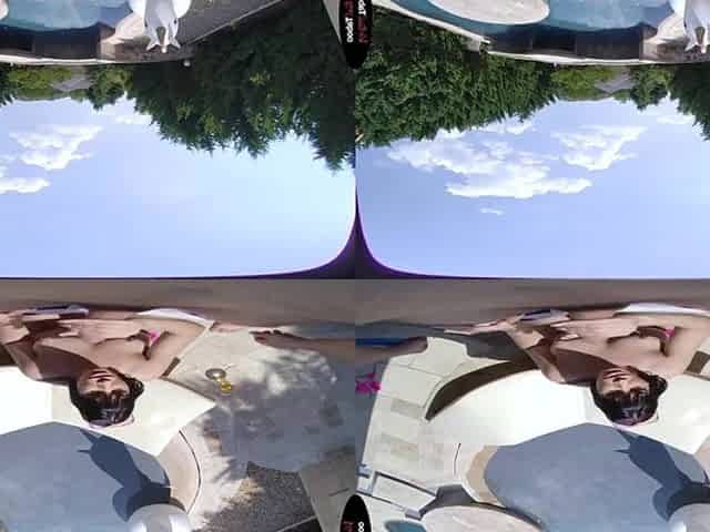 Two men fuck and facialize naughty bitch with perky tits by the pool