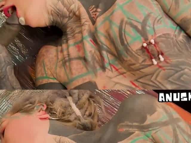 Hot Tattoed Skinny Brunette Fucked on Latex Mat
