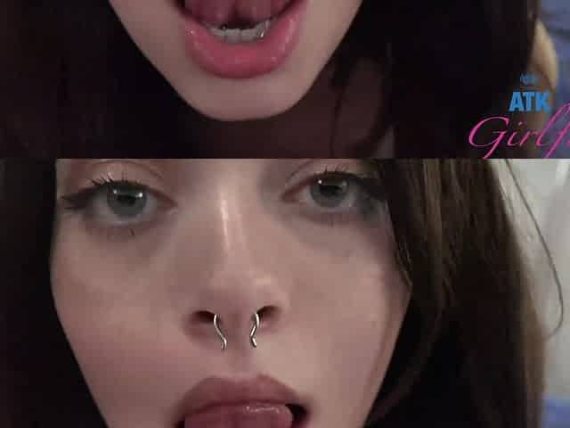 Sasha Sparrow and Stella Cardo lick each other's pierced breasts in bodysuit, Lesbian Show