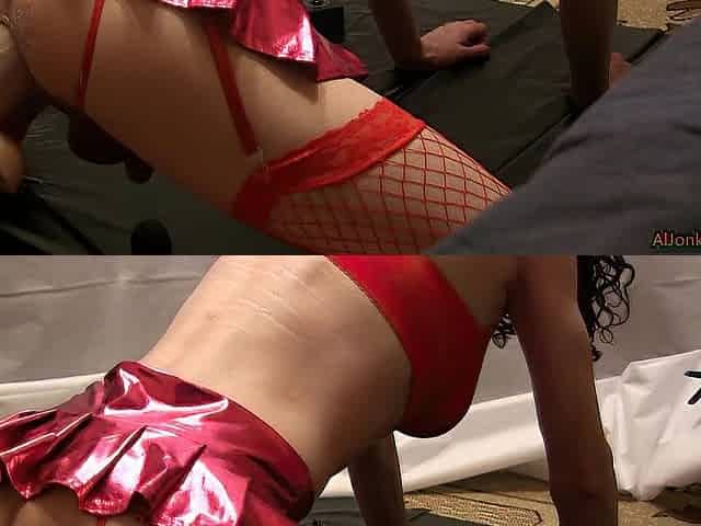 Sissy in red underclothing stretches a aperture inflatable sex toy
