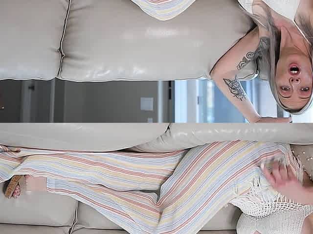 Tattooed Kitten with big boobs pleasuring herself on the sofa