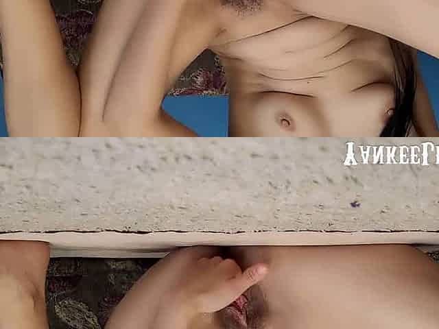 Solo brunette hair angel Polly Yangs with widen legs with fingers and a sex tool pleases a hairless twat in