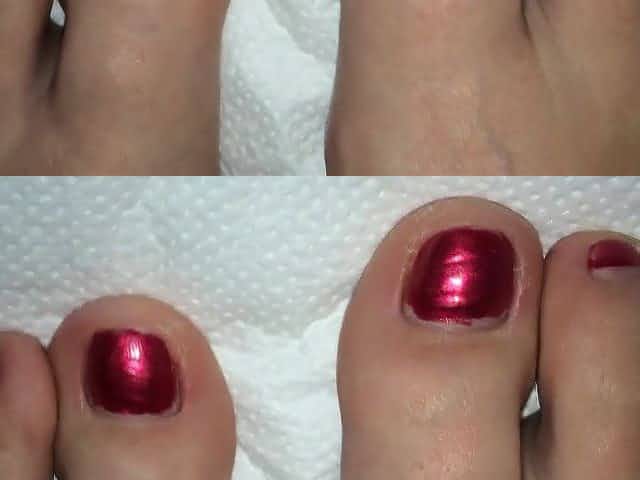 Feet play with toenails with white nail polish