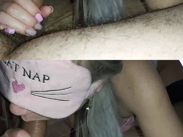 He puts his erect cock in my mouth, jerks it and pushes it deep down my throat