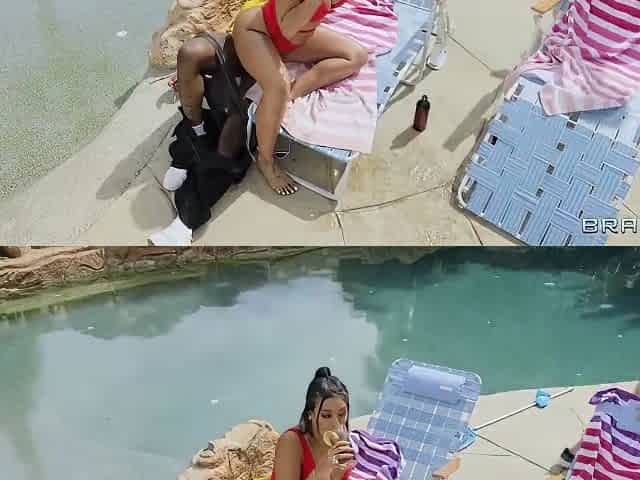 Sexy Chocolate Babe Masturbates And Fucks Lucky Stud By The Pool