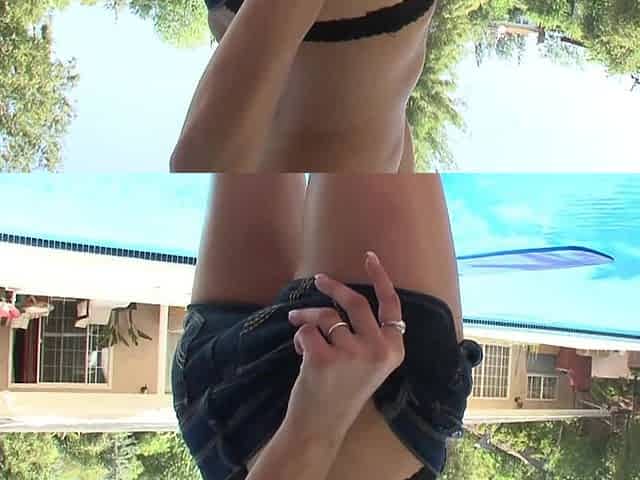 Teen cutie in backyard enjoys finger play in various kinky outfits
