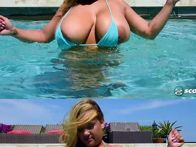 Big tits, a bikini and a pool