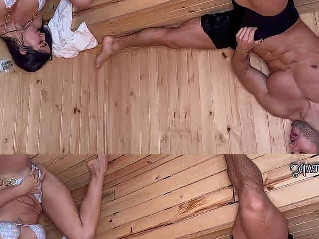 My fitness coach warms me up in the pool and shows me his large white schlong BWC