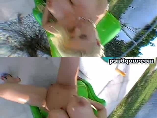 Busty and arousing blonde hottie Brandy Talore reveals her nice looking body and really huge breasts outdoor by the swimming poo