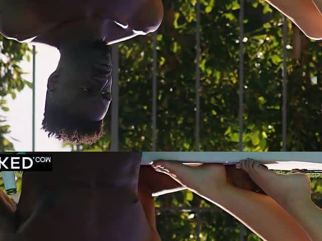 Fat ebony Ms.Yummy pleasuring her white lover by the pool