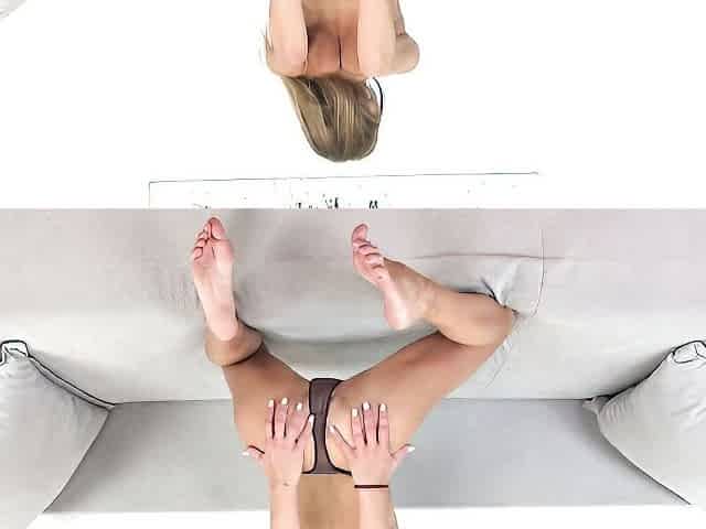 Big-boobed blonde Dominno is touching her hungry shaved pussy