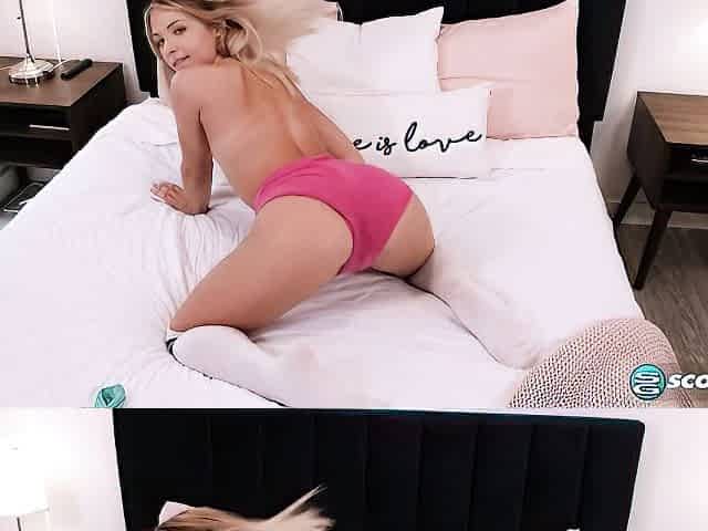 Gorgeous glamorous blonde Candy Alexa is touching her shaved pussy
