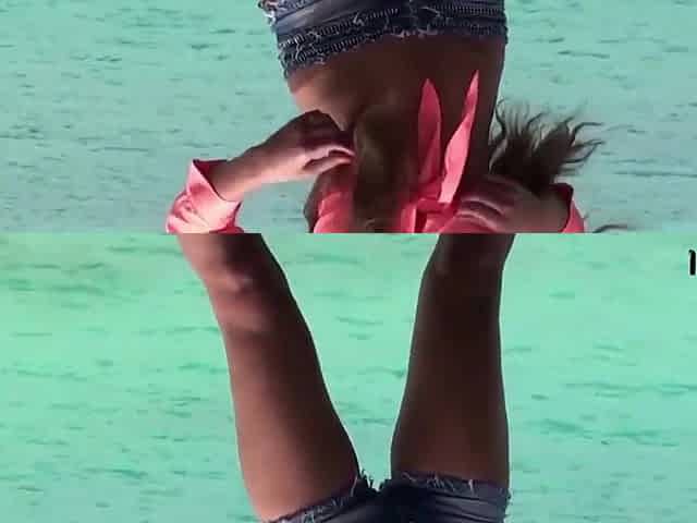 Claire shows her cameltoe in Closeup. Lying on a bed, Claire spreads her legs and plays with her panties, showing her cameltoe i