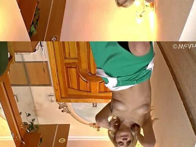 Small blond playgirl, Kat is posing in hawt, green underware, in front of the web camera