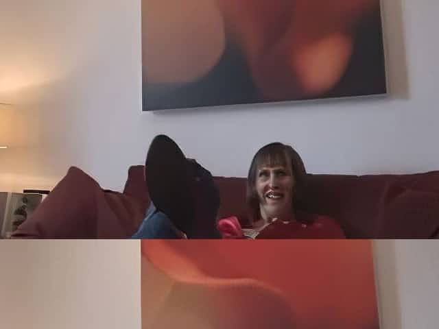 Jenna Sativa is posing in black boots with high heels, and getting more and more excited