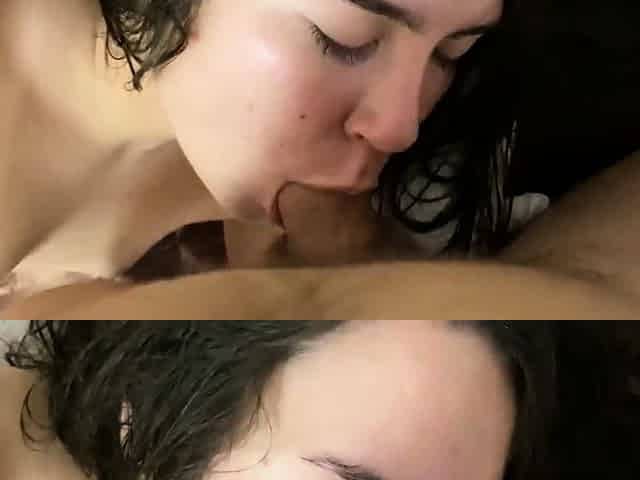 I give him a sweet blowjob and cums on my small tits Real