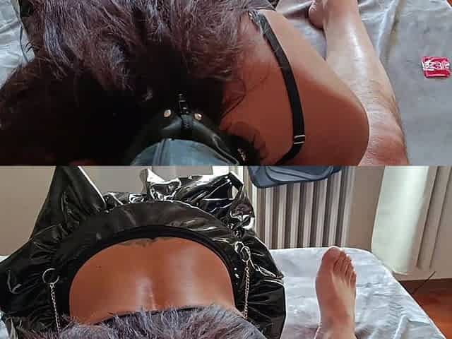 Amateur brunette in latex lingerie fucks hardcore in kitchen