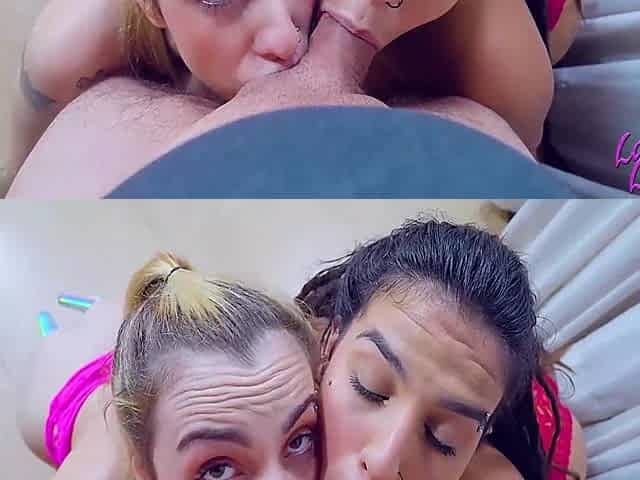Two spoiled dark haired chicks swallow one giant dick n POV camera
