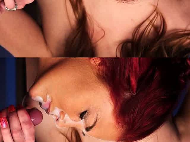 Big tits homemade brunette gets a facial while giving a blowjob
