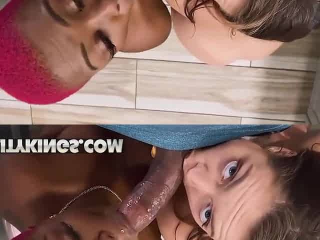 BJ girls suck cock very deeply in a threesome talking dirty in POV