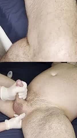Prostate massage with gloves and toy ends with an intense orgasm