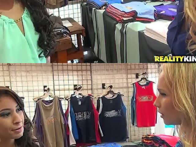Asian babe's fucked in a threesome in a movie rental store
