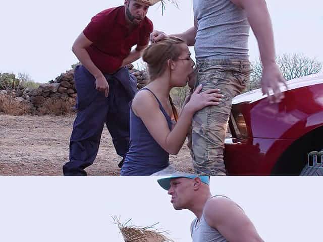 Two horny guys fuck mouth and pussy of slutty chick Alexis Crystal in public