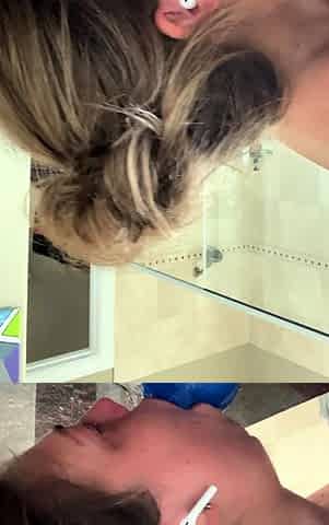 Hot Russian girl Ohh My Lyssa gets her groove on with a dildo in pink cuffs in front of the mirror