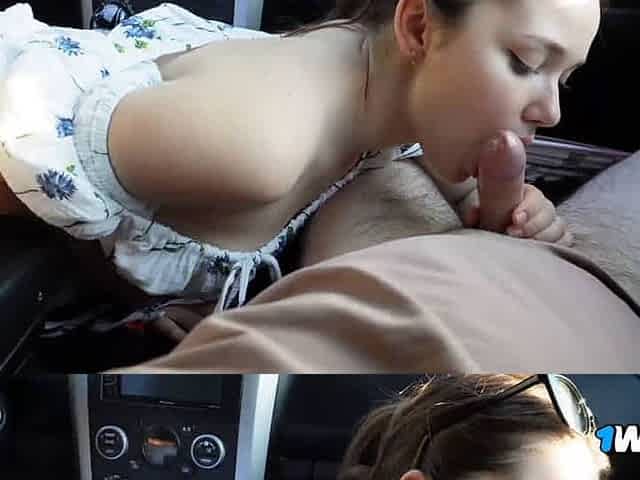 красотка сосёт член на дороге и получает много спермы на милое личико
