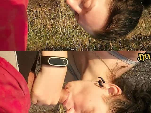 красотка сосёт член на дороге и получает много спермы на милое личико
