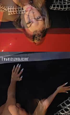 Porsha is brunette hair with tiny melons who is givving her all in a moving car.