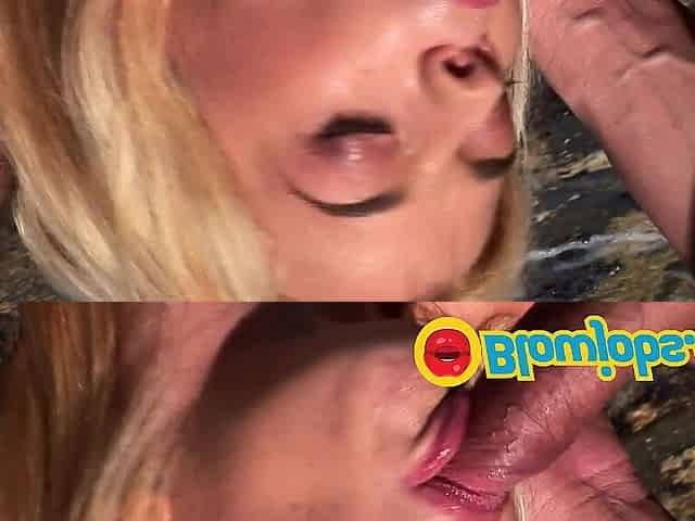 Busty slut sucks a cock by the lake and licks cumload