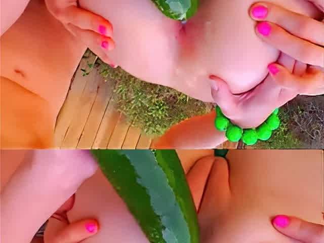 Cucumber Lesbians Ass Fucking in Garden
