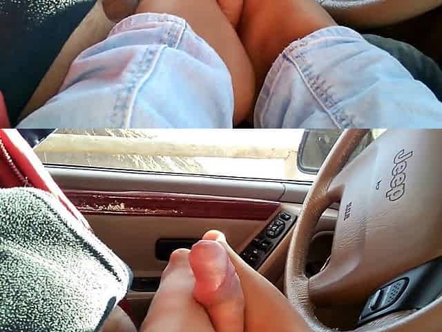 Naughty amateur couple gives handjob and footjob in the car - Cum on feet!