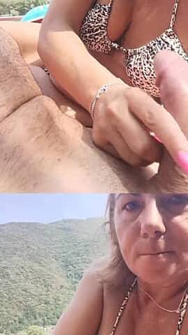 On the boat with my cousin I give him a tugjob and this guy cums on my face