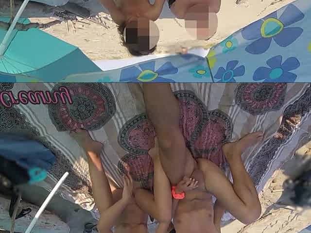 Il se masturbe et elle l'aide avec sa chatte ouverte à la plage nudiste en public