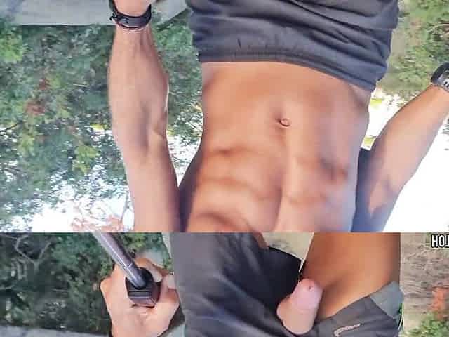 Wicked stud masturbating his large jock with a fleshlight in a public street with people passing by